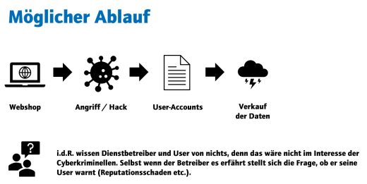 Einige Wochen später wird meingemuese24.com wegen einer Sicherheitslücke im Shopsystem von Internetkriminellen gehackt und alle Zugangsdaten der Kundenkonten werden kopiert. Die Betreiber von meingemüse24.com merken davon nichts, denn den Angreifern geht es nicht darum Schaden anzurichten, sondern um die erbeuteten Daten. Diese verkaufen sie im dunklen Teil des Internets an zwielichtige Gestalten. Mit den erbeuteten Passwörtern versuchen diesem, auf die E-Mail-Accounts der Personen mit einem Kundenkonto bei meingemuese24.com zuzugreifen.